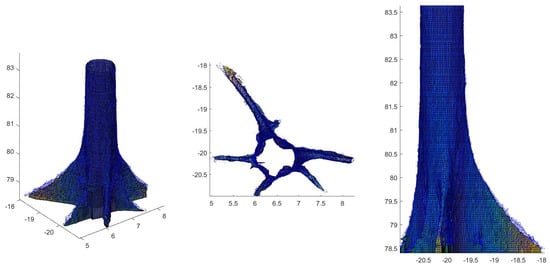 For 43 trees with large buttresses (selected by POM ≠ , visual inspection, and author’s expertise), a triangular mesh was used for the volume modelling in the bottom part of the stem rather than cylinders (Figure 3; see Disney et al. []). The volume of the mesh replaced the volume of the cylinders on the total tree volume estimation.