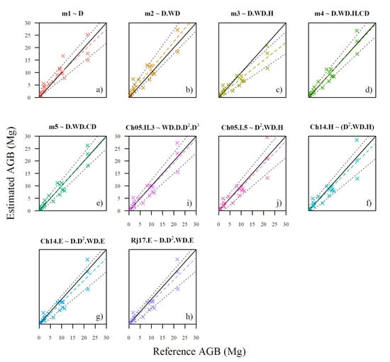 Among the pantropical models, Ch05.II.3 with just D and , had the highest and CCC and the lowest RMSE, but it slightly underestimated AGB (Table 4 and Figure 4). The two models including the “environmental stress” attribute (E; Ch14.E and Rj17.E) produced the largest underestimates of AGB in absolute terms but lowest relative error (Table 4). Pantropical models including H (Ch05.I.5 and Ch14.H) also underestimated AGB and were, by several metrics, the least accurate among all models evaluated (lowest , lowest CCC, and highest RMSE).