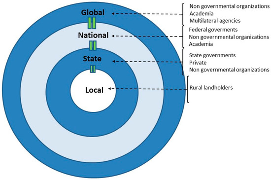 In this context, we view actors involved in forest restoration as nested across scales (Figure 1) and we aimed to assess similarities and differences in the narratives across scales regarding barriers and strategies for upscaling forest restoration. Here, we provide a summary of barriers and strategies highlighted in recent global FLR literature. We then present our findings from semistructured interviews conducted at national, state and local scales in Brazil. We based our local scale interviews in four, rural, Brazilian Atlantic Forest landscapes. Since 1934, the Brazilian government legally mandates rural landowners to restore riparian forests in their properties and, subject to farm size, an additional area called the “Legal Reserve”. This legal mandate is key to protect the estimated 53% of Brazilian biodiversity that remains in private lands countrywide. This value increases to 90% in the most populated Atlantic Forest Biome [18]. A revision of the law in 2012 improved the mechanisms for compliance and enforcement but also granted controversial amnesties to landowners who did not comply with their restoration requirements and reduced the areas that require restoration [19]. In the revised legislation, the Brazilian government requires landowners to declare areas on the property in need of restoration or else they would not be eligible for rural bank financing. After declaring, the landowners can enroll in a program to restore on or off their lands. In the latter option, the landowner can lease or purchase land with native vegetation from another owner in the same Biome, which gives flexibility to landowners in highly productive areas, but also risks that key watersheds remain unprotected [19]. In addition to the restoration mandate, the presence of a large constituency of actors that endorse forest restoration [20] makes Brazil an interesting case study with respect to its ability to meet Bonn Challenge commitments.