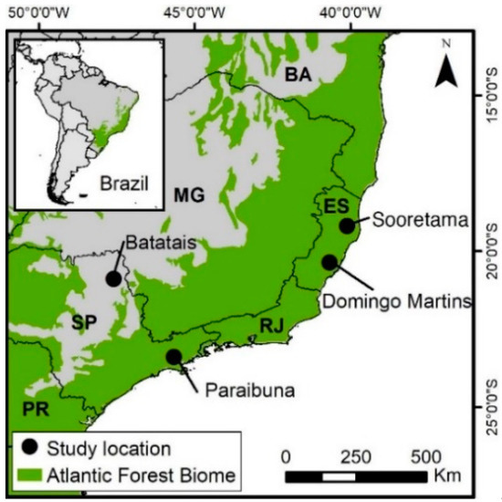 Map of Brazilian Atlantic Forest showing the four case study municipalities: Batatais and Paraibuna in the state of Sao Paulo, and Domingo Martins and Sooretama in the state of Espírito Santo.