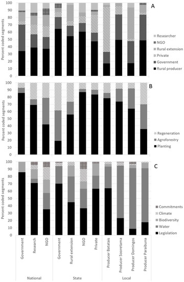 However, interviewees at different scales differed in the percent of times (defined as the number of times interviewees mentioned a specific actor divided by the total number of interviewees) they mentioned specific actors (X2 = 98.4, df = 10, p < 0.0001). Rural landowners across all four landscapes mentioned academic and NGO actors less compared to interviewees at other scales. Rural landowners from Paraibuna and Domingo Martins, municipalities with significant presence of rural extension, often mentioned the role of rural extension agents in helping them manage their properties and restore legally mandated areas. Rural landowners from Batatais mentioned private actors significantly more than other landowners given the support they receive from the Sugar Mill to restore riparian forests in their properties. The motivation of the Sugar Mill to support the landowners not only came as a means to comply with the legislation but also due to market pressure: