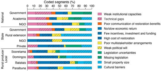An ecological modernization narrative centered on financial aspects prevailed in the barriers mentioned by all actors across all scales. High cost of restoration actions, few incentives or funding and no or slow economic return were commonly mentioned by all interviewees (Figure 4). Landowners, mainly from the mountainous areas of Paraibuna and Domingo Martins, found agroforestry interesting as some already plant fruit trees and grow shade-grown coffee, but they did not consider this activity as forest restoration. Landowners interviewed in all landscapes did not consider forest restoration as a potentially productive use of their land, as this quote from a rural landowner from Paraibuna exemplifies: