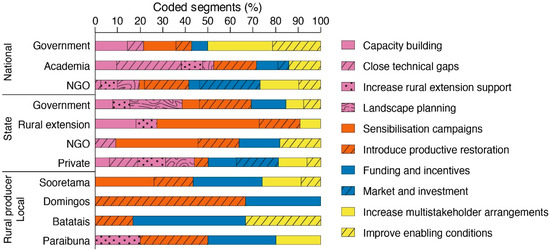 An ecological modernization narrative dominated the barriers and strategies for increasing the scale of forest restoration mentioned by actors at all scales. The main themes mentioned were the high cost and slow results of forest restoration and the need to increase long-term funding and investment opportunities. Rural landowners highlighted that government incentive programs exist, yet they are still not enough to conduct forest restoration. They see forest restoration mostly as a legally mandated environmental action important for water conservation. As such, rural landowners differed from global, national, and state actors by not perceiving productive restoration as a forest restorative action. This may be a legacy from the recent past where environmental restoration of riparian areas was the only restorative action promoted and enforced by the government [63].