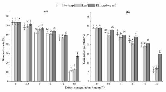 Germination rate (a) and potential (b) of L. formosana seeds following treatment with different concentrations of C. migao pericarp, leaf, and rhizosphere soil aqueous extracts. Lowercase letters represent significant differences in each treatment group (p < 0.05).