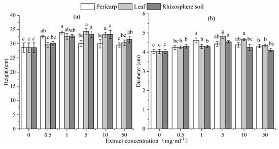Seedling height and ground diameter of L. formosana increased initially and then decreased slowly with increased extract concentration, but even the lowest values remained higher than CK values (Figure 2). When the concentration of aqueous leaf and rhizosphere soil extract was 1–10 mg mL−1, the difference in height between treated seedlings and CK was significant (p < 0.05). When the concentration of aqueous pericarp extract was 0.5–1 mg mL−1, the difference in height between treated seedlings and CK was significant (p < 0.05). When the concentration of aqueous pericarp and rhizosphere soil extracts was 0.5 mg mL−1 and 10–50 mg mL−1, respectively, the difference in ground diameter between treated seedlings and CK was not significant (p > 0.05); however, this difference was significant after treatment with different concentration of aqueous leaf extract (p < 0.05).