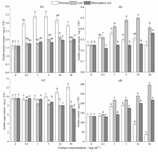 The soluble sugar content of seedlings was significantly higher than that of CK (p < 0.05) when the concentration of aqueous pericarp extract was 10 mg mL−1, and the highest content was achieved when extract concentration reached 50 mg mL−1. The soluble sugar content gradually decreased with increase in the concentration of aqueous extract leaf and rhizosphere soil extracts.