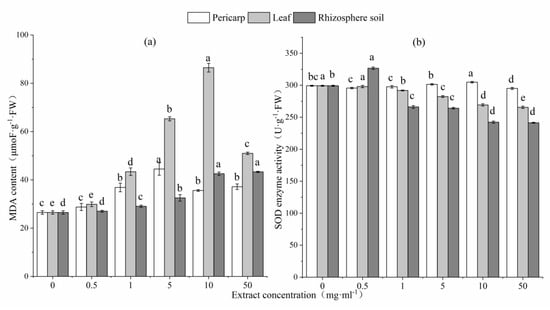 SOD activity in treated L. formosana seedlings was significantly higher than that in CK (p < 0.05) when the concentration of aqueous pericarp extract was 10 mg mL−1. SOD activity in L. formosana seedlings was significantly higher than that in CK (p < 0.05) when the concentration of aqueous rhizosphere soil extract was 0.5 mg mL−1, but it was significantly decreased at all other concentrations (p < 0.05). SOD activity in L. formosana seedlings decreased with increase in the concentration of aqueous leaf extract.