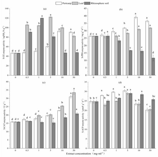 Activities of soil urease (S-UE) (a), polyphenol oxidase (S-PPO) (b), catalase (S-CAT) (c), and phosphatase (S-ACP) (d) in L. formosana seedlings following treatment with different concentrations of C. migao pericarp, leaf, and rhizosphere soil aqueous extracts. Lowercase letters represent significant differences in each treatment group (p < 0.05).