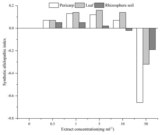 Eleven indicators (germination index, morphology, physiological and biochemical indices of seedlings, etc.) were used to analyze the allelopathy SE value to reflect the total allelopathic intensity of the C. migao pericarp, leaf, and rhizosphere soil at different concentrations on the target L. formosana (Figure 6).When all the extracts were at low and medium concentrations (0.5–5 mg mL−1), they promoted the growth of L. formosana. When the aqueous leaf extract concentration was 5 mg mL−1, the maximum value was 0.14. When the concentration of the rhizosphere soil extract was 10 mg mL−1, the growth began to show slight inhibition. When the concentration of all extracts reached 50 mg mL−1, the inhibition effect was very obvious and reached the maximum value (0.56) under the treatment of the pericarp extract. According to the synthetic allelopathic index, the comprehensive effect value of leaf extract liquefaction was significantly higher than that of the pericarp and rhizosphere soil.