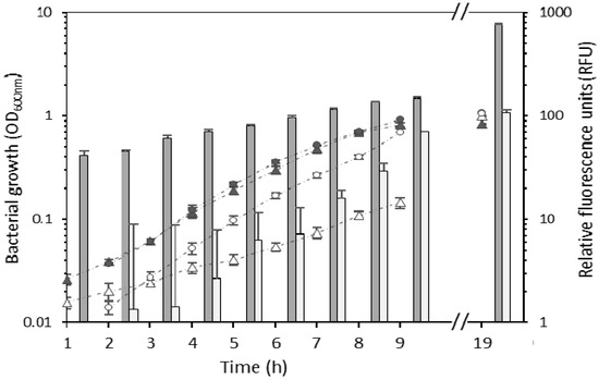 Growth of wild type Erwinia billingiae S31R1 (grey circles), wild type Bacillus simplex S11R41 (grey triangles), E. billingiae/pNmI (white circles) and B. simplex/pNF8 (white triangles). Bars represent the mean of the relative fluorescence at each time point for B. simplex/pNF8 (dark grey) or E. billingiae/pNmI (light grey). Error bars indicate the pooled standard deviation of the three biological replicates and three technical replicates. Measurements were not taken in the time period corresponding to the horizontal axis break.