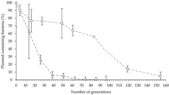 In vitro plasmid maintenance in E. billingiae/pNmI (white circles) and B. simplex/pNF8 (white triangles). Error bars indicate the standard deviation of four biological replicates.