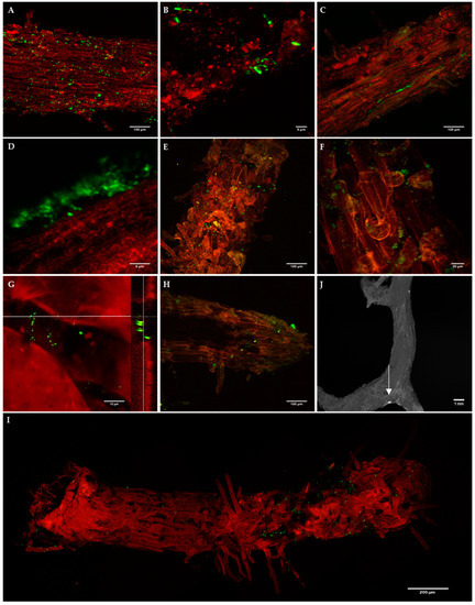 The presence of both biocontrol bacterial strains on P. radiata roots was detected by epifluorescence microscopy and/or confocal microscopy, although colonization patterns of E. billingiae and B. simplex were different (Figure 3). B. simplex was found from 1 DAI to 31 DAI, initially mainly on the surface of older root tissues, distributed randomly and sometimes in clusters (Figure 3A,B,E). An abundance of B. simplex was also noted on the substrate surrounding P. radiata roots. At a later colonization stage (24 DAI and 31 DAI), bacterial clusters appeared on new tissues and at the base of emerging lateral roots (Figure 3G,I,J). E. billingiae was found from 1 DAI to 16 DAI colonizing the intercellular spaces within the epidermal tissue and appeared in clusters of high density in deeper layers (Figure 3C,D,F,H). There was a distinct presence of the bacteria on root hairs. In general, both bacterial strains were more abundant on the upper portions of the roots although they were present all along the roots.