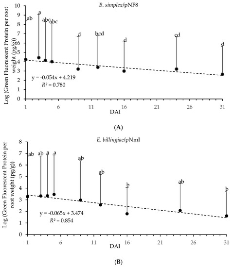 Log transformed GFP content (pg) from E. billingiae/pNmI (B) and B. simplex/pNF8 (A) per root weight (g) over 31 days determined by ELISA. Error bars indicate the pooled standard deviation calculated from the standard deviation of the measured GFP concentration of the replicates and the standard deviation obtained for the plant weights. Statistically significant differences of p < 0.05 in GFP content in E. billingiae/pNmI (B) or B. simplex/pNF8 (A) over time are presented with lowercase letters.