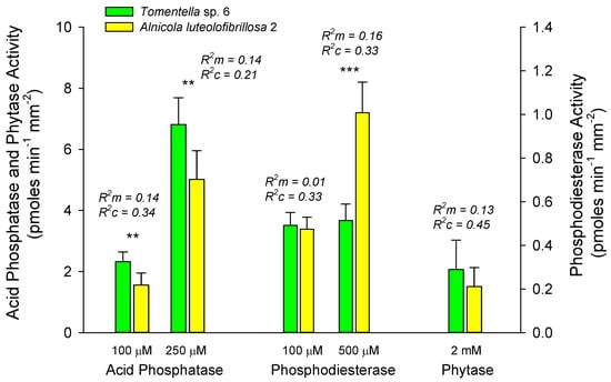 - Alvarez, M.; Huygens, D.; Díaz, L.M.; Villanueva, C.A.; Heyser, W.; Boeckx, P. The spatial distribution of acid phosphatase activity in ectomycorrhizal tissues depends on soil fertility and morphotype, and relates to host plant phosphorus uptake. Plant Cell Environ. 2012, 35, 126–135. [Google Scholar] [CrossRef]