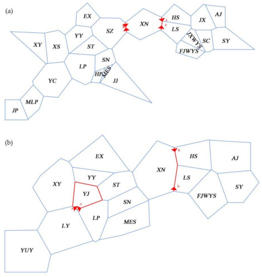 The first two genetic barriers in L. chinense projected by Barrier 2.2. (a) The first two genetic barriers in L. chinense based on cpDNA. (b) The first two genetic barriers in L. chinense based on five nuclear genes. The red lines with two opposite arrows indicate the barriers (a,b). The black letters represent the abbreviated names of sample locations.