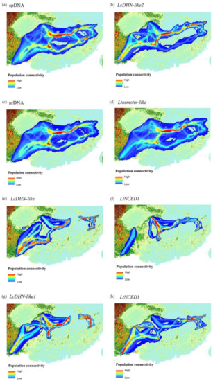 Construction of dispersal networks for L. chinense based on cpDNA, nrDNA, and six nuclear genes sequences (a–h). Warmer color depicts higher population connectivity.