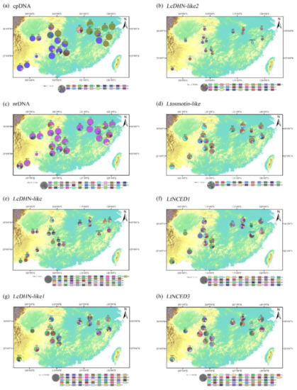 Geographic distribution of haplotypes of cpDNA, nrDNA, and six nuclear genes (LcDHN-like, LcDHN-like1, LcDHN-like2, LtNCED1, LtNCED3, and Ltosmotin-like) in L. chinense (a–h). Pie chart size is proportional to its numbers. The map was created by ArcGIS 10.2.