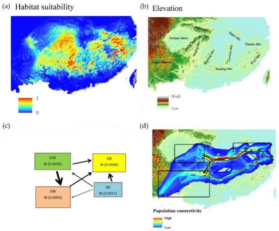 Gene flow estimates for L. chinense. Arrow width depicts the extent of gene flow between populations. (a) “Current” species distribution model of L. chinense; warmer colors represent areas of higher habitat suitability. (b) Digital elevation model (DEM) and distribution of mainly mountains in subtropical China. (c) We estimated gene flow between each pair of the four populations with a coalescent-based framework implemented in MIGRATE 3.6.11, and the numbers in rectangles represent effective population size. (d) The results of MIGRATE overlaid onto the dispersal network.