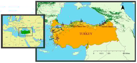 Turkey and distribution of hardwood forest in Turkey (derived from Food and Agriculture Organization (FAO) Data in Arc Map). All evaluated sites are indicated with site numbers and province borders. Study sites were located in the following provinces: (1) Şile, (2) Zonguldak, (3) Sinop, (4) Artvin, (5) Rize, (6) Trabzon, (7) Çanakkale, (8) Aydın, (9) İzmir, and (10) Bursa.
