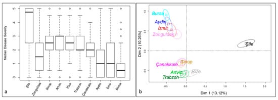 For this study, 1500 trees on 97 plots in 10 sites were scored for tree health. Overall, 96 households participated in ethnobotanical interviews. In the case of one chestnut plot which we evaluated, the associated household was unable to participate in interview activities. Shown in Figure 2a,b, significant variance in tree health was observed between sites. Three clear tree health groupings of high, medium, and low health are apparent in the MCA output (Figure 2b). We refer to these groups, respectively, as 1, 2, and 3. These can be conveniently remembered as first, second, and third place in tree health. Group 1 includes the sites of Bursa, Aydın, İzmir, and Zonguldak. Group 2 includes the sites of Çanakkale, Sinop, Artvin, Trabzon, and Rize. Group 3 includes the single site of Şile (Figure 1).