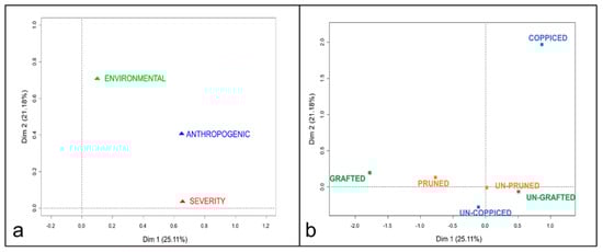 MFA results illustrate correspondence between variable groups as proximity. In this case, results show that anthropogenic factors correspond more closely with disease severity than do environmental ones (Figure 3a,b). In Figure 3b, the alignment of grafting along the axis most closely associated with severity again indicates its power as a factor.