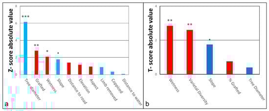 (a) Effect size of all factors on disease severity for trees as represented by absolute value of z-score generated by GLMM; (b) Effect size of significant factors on median plot disease severity as represented by absolute value of t-score generated by LMM. Lighter color indicates a positive correlation and darker, a negative correlation. For both charts, significance indicated as *** representing 0, ** representing 0.001, * representing 0.01, and • representing 0.05.