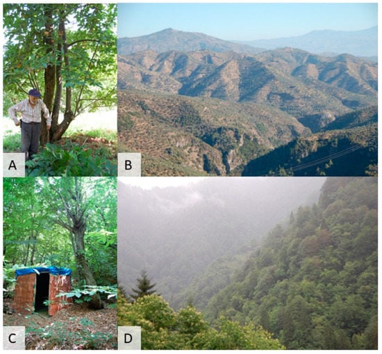 We conducted our study in geographical areas where the genetic diversity of the chestnut species has been maintained for millennia. We hypothesized that anthropogenic influences, such as livelihood practices and the knowledge that informs them, on tree health across various landscapes would be significantly independent of other factors. Therefore, this study endeavors to identify and understand the role of traditional livelihood practices and local knowledge in the maintenance of a plant population that is (1) ecologically important [58], (2) indispensable for local livelihoods [59,60], (3) historically anthropogenically maintained [61,62], and (4) under threat and targeted for state conservation [10], while at the same time accounting for the ecological and physical geographic factors that are conventionally analyzed for their effect on plant disease severity.