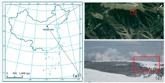 (a) Location of the study area in North-Central China; the study area landscape in summer (b) and winter (c).