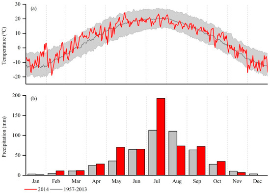 Comparison of (a) the mean daily air temperatures and (b) the monthly sums of precipitation for the monitoring year of 2014 (red) and the 1957–2013 average (light grey). The grey shading in (a) indicates the mean minimum and maximum temperatures averaged over the 1957–2013 period. Data were obtained from the nearest state standard meteorological station in Wuzhai (38°55′ N, 111°49′ E, 1401 m a.s.l., linear distance approximately 20 km north of the study site).