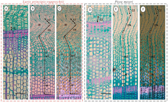 Phases of secondary growth in Larix principis-rupprechtii (A–C) and Picea meyeri (D–F) on the same date. (A,D): on 24 April, no new xylem cell production was observed and the cambial zone (CZ) consisted of seven to eight cells and five to six cells for larch and spruce, respectively; (B,E) and (C,F): on 20 July, enlarging (EN), wall-thickening (WT), and mature (M) cells under bright field and polarized light, respectively; scale bar = 100 μm.
