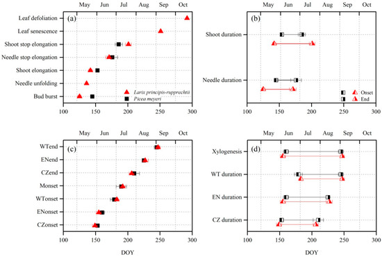 Larch started primary growth (needle and shoot growth) earlier than spruce (Figure 5a,b), with the onset and end timing of each phase between the two species having significant differences (Mann–Whitney rank-sum test, p < 0.05, Table S1). The occurrence of bud burst was on DOY 125 (5 May) and 145 (25 May) in larch and spruce, respectively, and the following bud phenology was subsequently earlier in larch than in spruce. Needle growth was more than one month and lasted 46 days for larch from early May to mid-June and 31 days for spruce, mainly in June. Shoot elongation occurred approximately three and two weeks after bud burst in larch and spruce, respectively. Shoot growth duration, which was much longer in larch than in spruce, was 59 days (DOY 142–201, 22 May –20 July) and 33 days (DOY 153–186, 2 June–5 July), respectively.