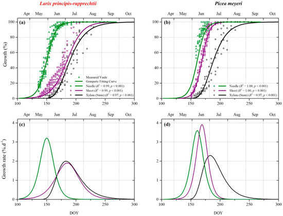 (a,b) Intra-annual dynamics of primary growth and secondary growth and (c,d) the daily growth rate of larch and spruce. Measured data (scatter) are given as a percent of the final growth and modeled by the Gompertz function (line) (for parameters, see Table S3).