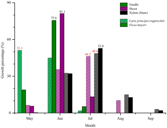 Consistent with the onset timing sequence, the end sequence of the three organs was also needle, shoot, and stem. Additionally, the mean growth rate (relative percent) of the needle, shoot, and stem were 1.94%, 1.20%, and 1.22% and 2.02%, 2.33%, and 1.43% for larch and spruce, respectively (Table S3). Therefore, the duration was shortest in needle growth and longest in stem growth. This result is owing to the plant carbon acquisition via leaf photosynthesis, with the leaf having a higher priority to uptake and allocate carbon than the stem [36]. Martínez-Vilalta et al. [37] assembled a global database to examine patterns of seasonal NSC variation across organs and pointed out that NSC concentrations were highest in leaves and lowest in stems, which was consistent with our results. Shoots play a connective role between the carbon–source organ (leaf) and the carbon–sink organ (stem) [38]. After trees finished canopy building, surplus carbohydrates were transferred by shoots, and then invested into stem growth and/or root storage; this phenomenon explained the time lag between the needle growth and stem xylem growth [39].