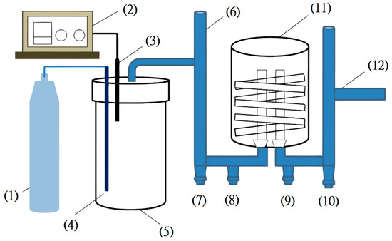 Schematic diagram of the heat-treated equipment. (1) N2 cylinder, (2) Controller, (3) Thermocouple, (4) Air supply tube, (5) Heat-treated body, (6) Condenser, (7~10) Liquid-collecting vessels, (11) Water cooling tower, (12) Exhauster.