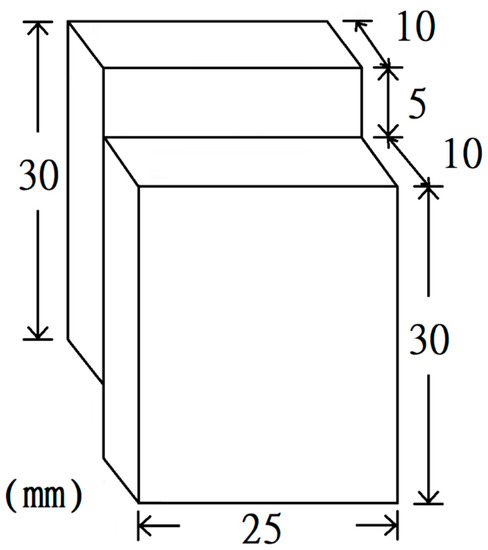 The shear bonding strength of heat-treated wood specimens were measured by compression loading in accordance with Chinese National Standards (CNS) 5809. The heat-treated and untreated woods were cut into thickness of 10 mm specimens and the out-layer with radial section of the heat-treated wood was as a glue surface. The UF resin (with adding 1% NH4Cl as a catalyst) and PVAc were applied on both sides of the interface (200 g/m2 for each layer), respectively. The specimens were pressed by compression molding machine at room temperature and pressure of 1.47 MPa for 48 h. After conditioning at room temperature for 48 h, the glued samples were cut into 30 mm (L) × 25 mm (R) × 20 mm (T) as shown in Figure 2. Normal shear strength test of the specimens was conducted with a Universal Testing Machine (Shimadzu UEH-10, SHIMADZU Co., Kyoto, Japan) at a crosshead speed of 1 mm/min with duplicates of 10, and wood failure was noted.