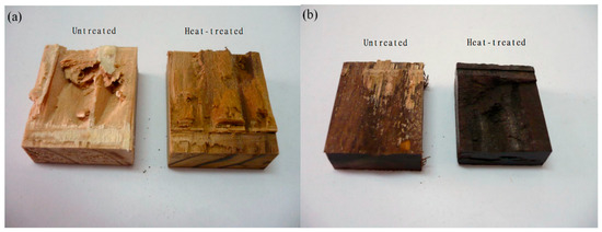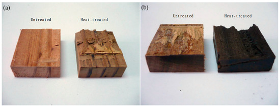 Appearances of untreated and heat-treated Japanese cedar (Cryptomeria japonica) (a) and Formosa acacia (Acacia confusa) (b) wood after the 50-day decay resistance test.