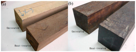 A new environment-friendly method used to enhance the dimensional stability and durability of wood is heat treatment. This technique is suitable for wood due to its non-toxic characteristics. In heat-treated wood, physical and chemical properties such as density, equilibrium moisture content, roughness, and strength are altered by submitting wood to high temperatures (150–230 °C) in an inert or restricted air environment. The dimensional characteristics and decay resistance of wood can be improved and the treatment results in a uniform dark color. However, its strength is decreased as compared to those of untreated control samples. The use of heat treatment as a wood modification method and its products have increased significantly over the last decade and have been well studied [6,7,8,9,10,11,12,13,14,15]. However, in practical utilization, the adhesion, finishing, and decay resistance performances of heat-treated wood have not been examined enough.