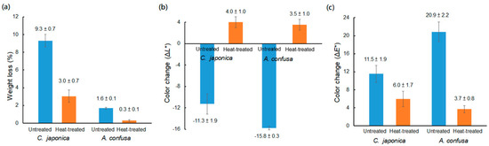 Weight loss (a) and color changes (b,c) of untreated and heat-treated Japanese cedar (Cryptomeria japonica) and Formosa acacia (Acacia confusa) wood after the 50-day decay resistance test.