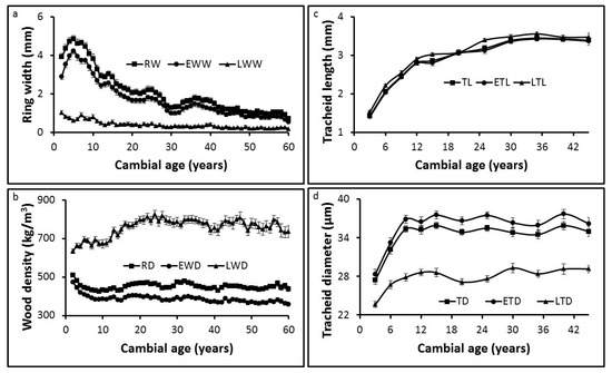Intra-ring and inter-ring radial variations of growth-related, density-related, and anatomical wood properties: (a) Ring width (RW), earlywood width (EWW), and latewood width (LWW). (b) Ring density (RD), earlywood density (EWD), and latewood density (LWD). (c) Average ring tracheid length (TL), earlywood tracheid length (ETL), and latewood tracheid length (LTL). (d) Average ring tracheid diameter (TD), earlywood tracheid diameter (ETD), and latewood tracheid diameter (LTD). Bars indicate standard errors of the mean.