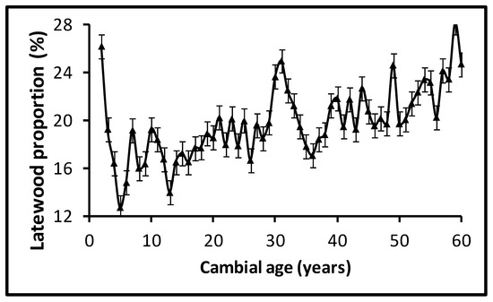 Inter-ring radial variations of latewood proportion (LWP). Bars indicate standard errors of the mean.