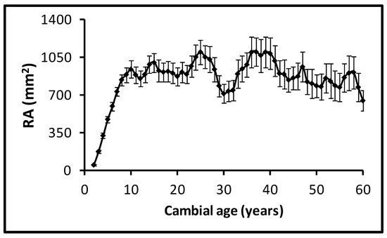 The large radial growth near the pith is typical of the first growing year, where the competition between crowns is limited and tree growth is vigorous [18]. Larson, Kretschmann, Clark III, and Isebrands [18] explained the reverse pattern of RA compared to RW by the fact that tree circumference invariably grows with age. Therefore, a stable RW or slightly decreasing RW along the tree radius will invariably increase the RA and tree volume. Both RA and RW are an expression of tree growth [57]. However, RA provides information about the radial and tangential growth, and its radial pattern is not as misleading as that of RW [25].