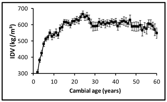 Inter-ring radial variations of the intra-ring density variation (IDV). Bars indicate standard errors of the mean.