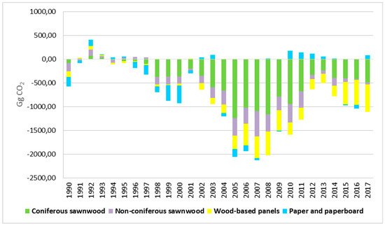 This analysis evaluates the annual changes of the carbon stock in HWP within the domestic consumption and allows for its comparison with defined theoretical models. The differences between gains and losses of CO2 from domestically produced and used HWP for the period 1990–2017 (Tier 2 method) are shown in Figure 1 (S0 scenario). In the depicted figure the positive values represent the greenhouse gas emissions; the negative values represent the removals of carbon from the atmosphere. All values are expressed in Gg CO2.year−1.