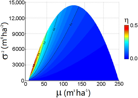 where μ represents regional stocking volume. This is for any probability distribution where xmin and xmax are known. Here μ and Dm define a parabola going downwards in the μ − σ2 plane. Dm becomes a boundary of the curved surface η(μ, σ2) (Figure 1). The derivation of Dm is detailed in Appendix A.