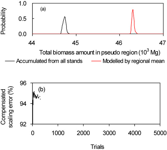The efficiency and ability of the compensator to reduce scaling error is tested by 5000 trials. The mean of total biomass amount (true value) and the mean of modelled biomass amounts in the pseudo region are 44.7 and 46.3 (t), respectively (Figure 2a). It shows an approximate 3.5% overestimate due to the scaling error. After compensating, around 94.8% of the scaling error is reduced on average. The average level illustrates that compensation rate tends to become stable with the increase of trials. When trials approach 4000 times, Figure 2b indicates a convergence. This implies that most of the scaling error should be removed using the compensator.