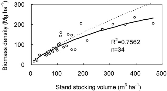 The results of the case study exhibit the percentage of scaling error that may occur from a biomass estimation of provincial scale forest ecosystem. The volume-to-biomass equation is parameterized using field measured data (Figure 3) for this estimation. After compensating scaling error, mean biomass density declines by 3.6% and becomes 69.1 (Mg ha−1). This can result in a total forest biomass of 201.8 (106 Mg) for this species in the province (Table 2). The amount of reduced scaling error is 7.7 (106 Mg) using σ2 = 1721 m6 ha−2. The fine dotted line (Figure 3) denotes the curve from the power-law equation. It cannot properly fit the measurements especially when the volume exceeds 200 m3 ha−1.