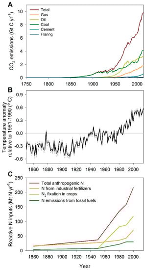- Reich, P.B.; Hungate, B.A.; Luo, Y. Carbon-nitrogen interactions in terrestrial ecosystems in response to rising atmospheric carbon dioxide. Annu. Rev. Ecol. Evol. Syst. 2006, 37, 611–636. [Google Scholar] [CrossRef]