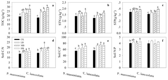 The effects of biochar fertilization on (a) soil organic C (SOC), (b) soil total N (STN), (c) soil total P (STP), and (d–f) soil stoichiometry under Pinus massoniana and Cunninghamia lanceolata. Different lowercase letters above bars in the same species mean significant differences at p ≤ 0.05. CK: control, LB: low biochar addition, MB: medium biochar addition, HB: high biochar addition.