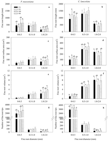 Results of two-way ANOVA on effects of species (Pinus massoniana and Cunninghamia lanceolata), biochar treatment, root diameter class, and their interaction on fine root length, fine root surface area, fine root volume, and number of fine root tips.