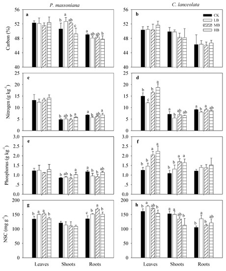 The effects of biochar fertilization on plant C (a,b), N (c,d), P (e,f), and nonstructural carbohydrates (NSC) (g,h) in Pinus massoniana and Cunninghamia lanceolata. Different lowercase letters above bars in the same plant compartment mean significant differences at p ≤ 0.05. CK: control, LB: low biochar addition, MB: medium biochar addition, HB: high biochar addition.